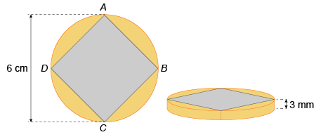 A figura ABCD tem a forma de um quadrado e é a base de um prisma que atravessa toda a medalha. A região da medalha externa a esse prisma será cunhada em ouro. Pretende-se cunhar 100 dessas medalhas.
