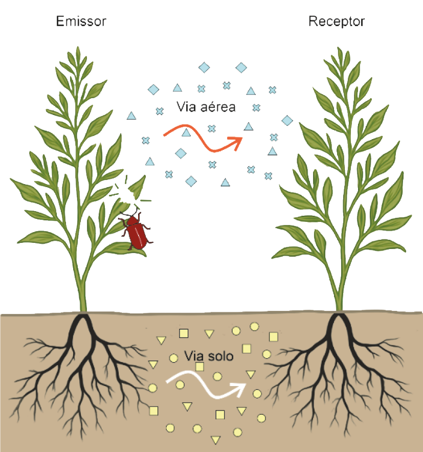 81) O processo de comunicação entre plantas discutido no texto pode ocorrer de diversas formas. Uma delas baseia-se na emissão de moléculas por uma planta atacada, chamada de emissor, e a recepção dessas moléculas por uma outra planta, chamada de receptor. Dependendo do tipo de ataque e das espécies envolvidas, essa comunicação pode acontecer tanto por via aérea, quanto por via do solo, facilitada pela água presente.