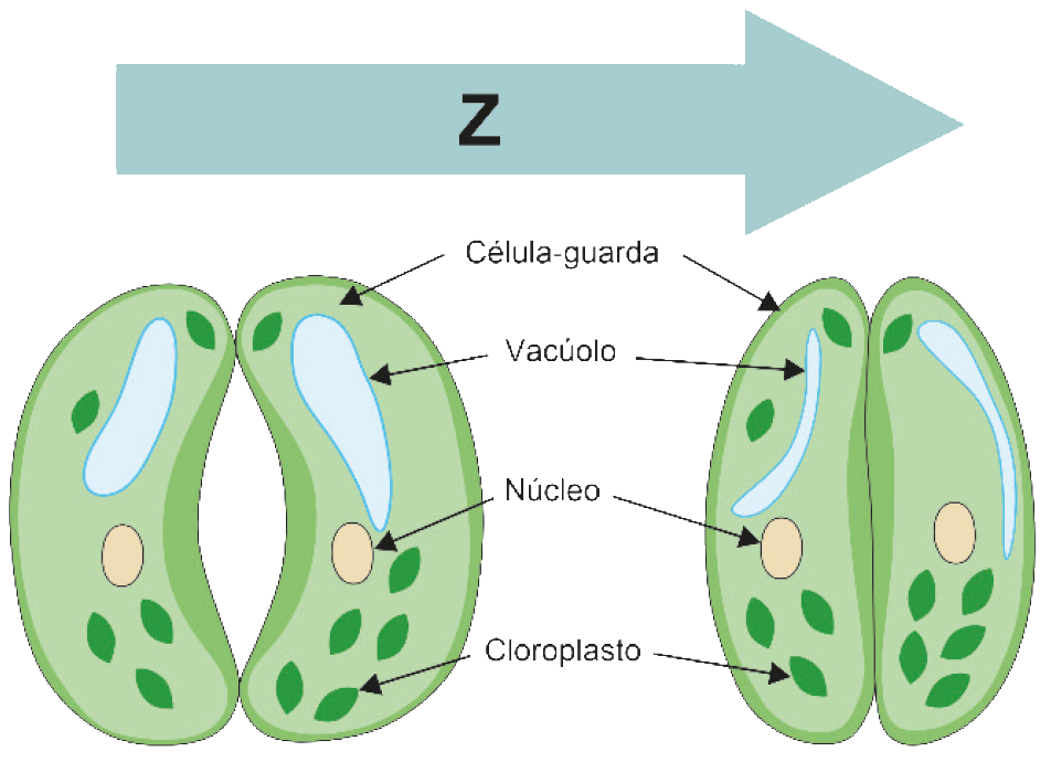 A seta "Z" indica fechamento de estômato. O processo é determinado pela saída de straight K+, para células anexas, as quais se tornam hipertônicas. Com isso, as células estomáticas perdem água, têm redução de tergescência e ocorre o fechamento estômático.