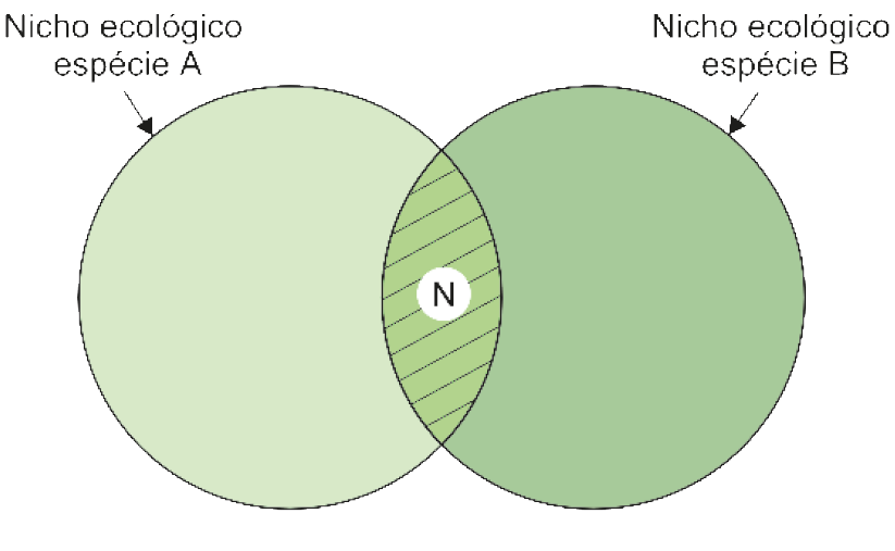 A figura indica a área "N" de sobreposição do nicho ecológico de duas espécies. Isso signficia competição pelo mesmo recurso ambiental. Essa competição ocorre entre espécies diferentes (interespecíficas) e entre indivíduos da mesma espécie (intraespecífica).