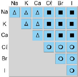 Adaptando essa ideia, foi feito um jogo para identificar os tipos de ligações entre os elementos Na, K, Ca, C , Br e I. Assinale a alternativa que representa a melhor marcação do tipo de ligação formada por esses átomos, seguindo a legenda: